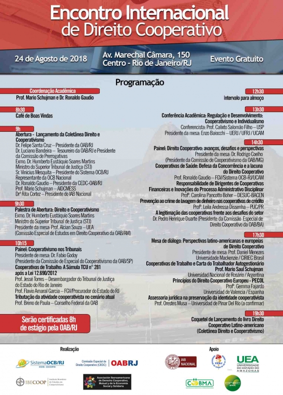 No dia 24 de agosto, a cidade do Rio de Janeiro (RJ) receberá o Encontro Internacional de Direito Cooperativo, evento que tem como objetivo apresentar discussões jurídicas ligadas ao cooperativismo e ampliar a interlocução estratégica e a visibilidade do tema em universidades, magistratura, procuradorias e órgãos de fiscalização. Destinado a gestores de cooperativas, advogados, estudantes e professores universitários, o evento será realizado pelo Sistema OCB/Sescoop-RJ, em parceria com a Comissão Especial de Direito Cooperativo da OAB/RJ (CEDC-OAB/RJ), a AIDCMESS (Asociación Iberoamericana de Derecho Cooperativo, Mutual y de la Economica Solidaria) e o Ibecoop (Instituto Brasileiro de Estudos em Cooperativismo). O local do encontro é o Plenário Antônio Modesto da Silveira, na Ordem dos Advogados do Brasil (OAB/RJ), no centro da capital fluminense e a entrada é franca.“O Direito Cooperativo efetivamente entrou no mapa e isso é estratégico para ampliar a atenção de diferentes setores da sociedade às questões jurídicas sensíveis às cooperativas. Um importante indicativo disso é a crescente participação de universidades, de associações científicas e de grandes nomes e autoridades que se envolvem com o tema”, afirma Vinicius Mesquita, presidente do Sistema OCB/Sescoop-RJ.